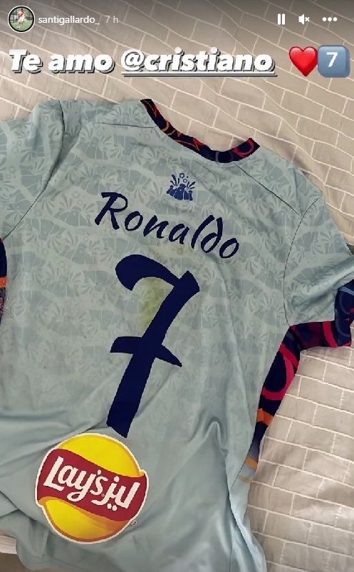 En una de sus tantas charlas, Gallardo le comentó la idolatría que Santino siente por él y CR7 le envió la camiseta que utilizó durante el partido que terminó con victoria del PSG por 5 a 4. El joven, de 15 años, sacó chapa del regalo recibido y compartió una historia en su cuenta de Instagram donde aparece la casaca acompañada por la frase "Te amo Cristiano".