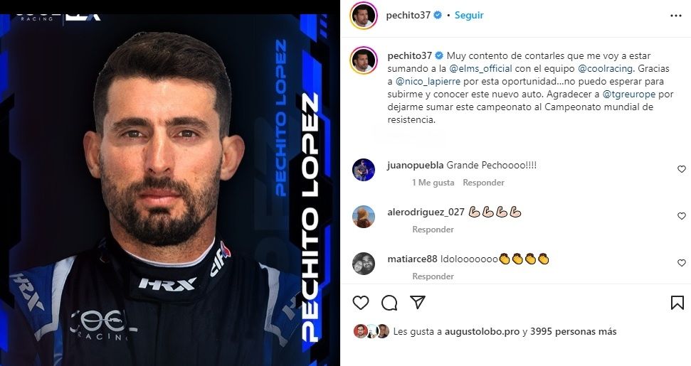 "Estoy seguro de que la competición será genial, todos luchando con el mismo auto. Parece emocionante y estoy deseando estar en pista" agregó Pechito. López consiguió su primera victoria en Le Mans junto a sus compañeros de equipo Toyota, Mike Conway y Kamui Kobayashi, en 2021, y terminó segundo en la carrera reina del WEC en otras tres ocasiones.