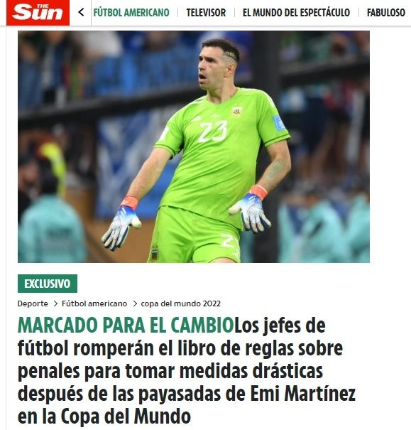 Además, el portal enumera los comportamientos del Dibu en Qatar que llevaron a pensar en realizar estos insólitos cambios: "Dejó caer el balón cuando parecía listo para dárselo a Steven Berghuis; pateó la pelota a un lado y miró fijamente a Teun Koopmeiners; pateó el punto penal cuando Luuk de Jong se acercó al área; retrasó a Kingsley Coman de Francia, incluida una protesta con el árbitro; sacó el balón afuera antes de que Aurélien Tchouameni lo remate, lo llevó a su línea y luego lo tiró al borde del área".