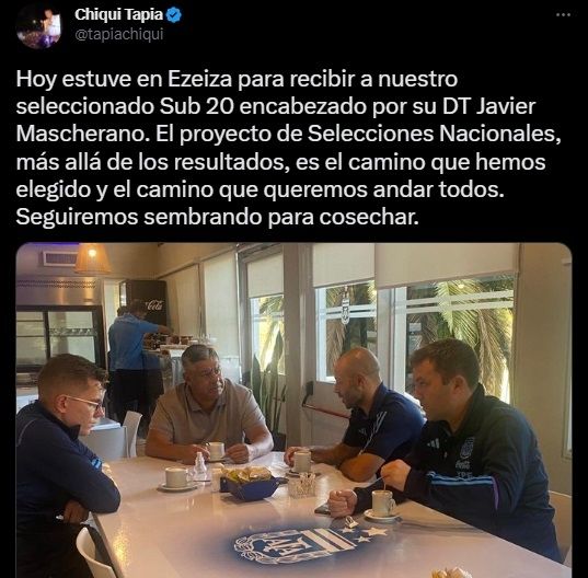 "Hoy estuve en Ezeiza para recibir a nuestro seleccionado Sub 20 encabezado por su DT Javier Mascherano. El proyecto de Selecciones Nacionales, más allá de los resultados, es el camino que hemos elegido y el camino que queremos andar todos. Seguiremos sembrando para cosechar", escribió Tapia en su cuenta de Twitter.