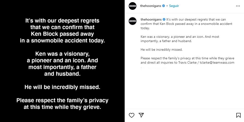 Y luego, agrega: "Pese a los esfuerzos por su rescate, Ken Block fue declarado fallecido en el lugar de los hechos a causa de las heridas sufridas en el accidente. Nos entristece la pérdida de Ken y nuestros corazones están con su familia y amigos tan profundamente afectados. Damos las gracias a todos nuestros servicios de emergencia por su continuo trabajo".
