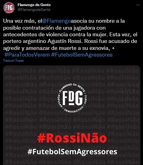 Las críticas se fundan en una acusación formulada en su contra en 2017, cuando aún era arquero de Defensa y Justicia y, en ese momento, la mujer expuso conversaciones con amenazas y compartió fotos con moretones. "Una vez más, el Flamengo asocia su nombre a la posible contratación de una jugadora con antecedentes de violencia contra la mujer. Esta vez, el portero argentino Agustín Rossi, acusado de agredir y amenazar de muerte a su exnovia", escribieron junto en el perfil de Twitter.