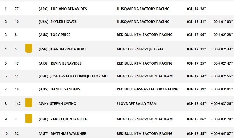 En la meta, aventajó en 1m03 a Skyler Howes, quien cuenta con 3m32 de renta en la general sobre el australiano Toby Price (KTM), tercero en la etapa tras haberse beneficiado de una bonificación de 1m36 por abrir pista. Cornejo, que salía segundo este viernes, marcó el mejor tiempo en el primer punto de control, el del kilómetro 31, con Howes, a cinco segundos, aunque con las bonificaciones el mejor crono era Adrien Van Beveren y, además, con 29 segundos de compensación.