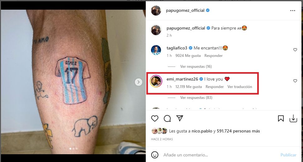 Martínez, ante el homenaje de uno de sus compañeros, no dudó en responder. El elegido como el mejor arquero del Mundial de Qatar dijo presente en el posteo y escribió: "I love you", acompañado del emoji de un corazón. Nicolás Tagliafico fue otro de los que respondió "¡Me encantan!".