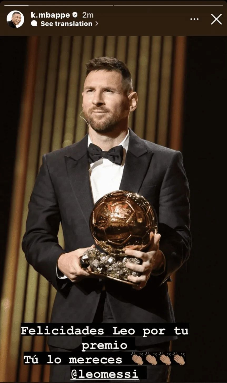 El delantero francés, ex compañero de Lionel Messi en el París Saint Germain, dijo presente subió una historias en la que dejó clara su postura con respecto a la premiación. Con una imagen del GOAT recibiendo el galardón, escribió: "Felicidades Leo por tu premio. Tú lo mereces", junto a varios emojis de unas manitos aplaudiendo.
