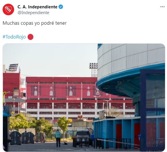 Junto a una foto tomada desde las inmediaciones del Cilindro de Avellaneda, con el estadio de Independiente de fondo y la imagen de algunas de las Copas Libertadores ganadas a lo largo de su historia, el CM de los Diablos Rojos escribió: "Muchas copas yo podré tener".