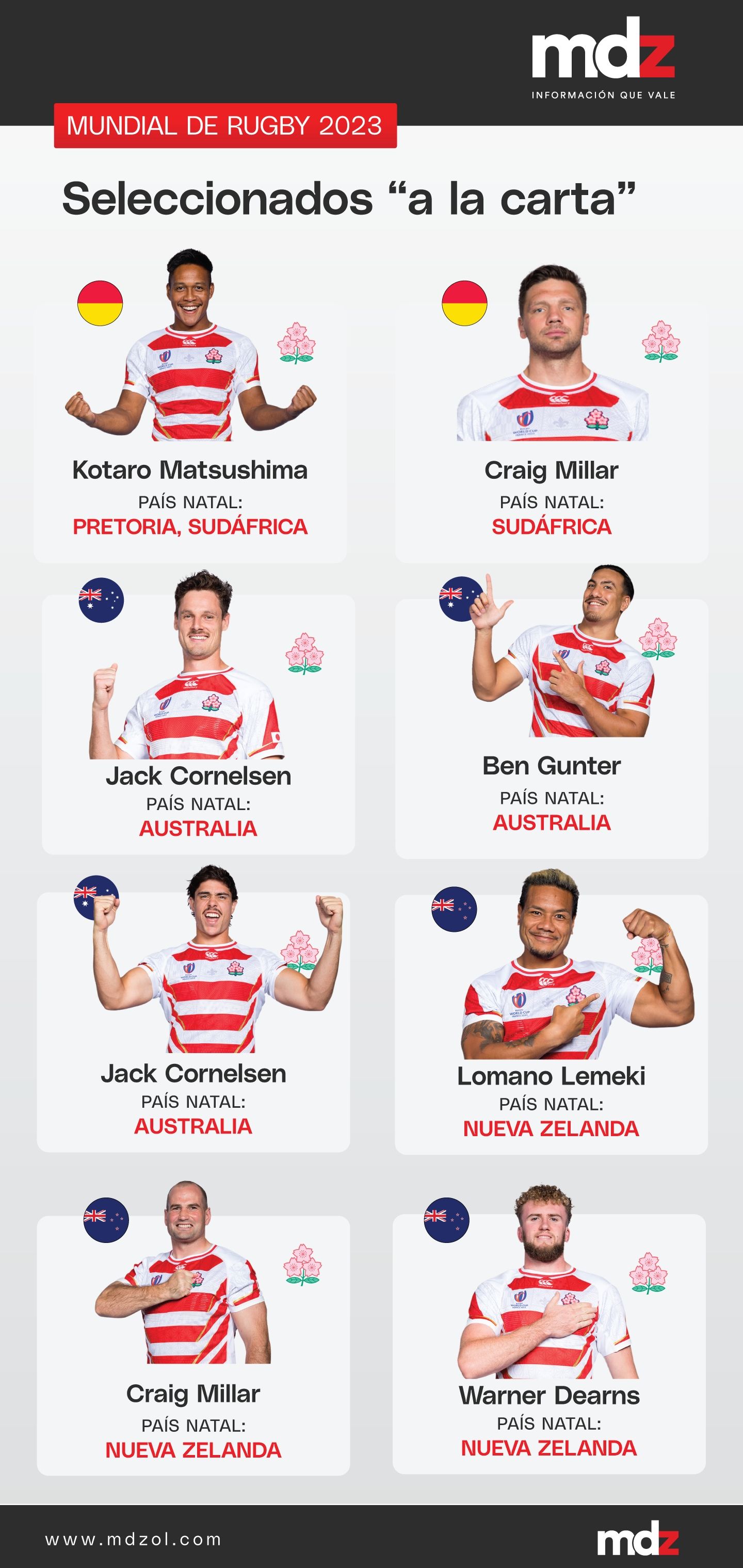 No obstante, quien les sigue en este ranking es Japón, que ha sabido nutrirse de talentos foráneos desde el primer Mundial en 1987, con los tonganos Sinali Latu y Nofomuli Taumoefolau, llegando a esta edición con medio equipo nacido en el exterior de su país, todos ellos representando clubes que participan de la pujante League One nipona, emergente certamen doméstico que reúne a muchos de los mejores jugadores del mundo, atraídos por buenos sueldos y un calendario amigable, compatible con la actividad internacional.