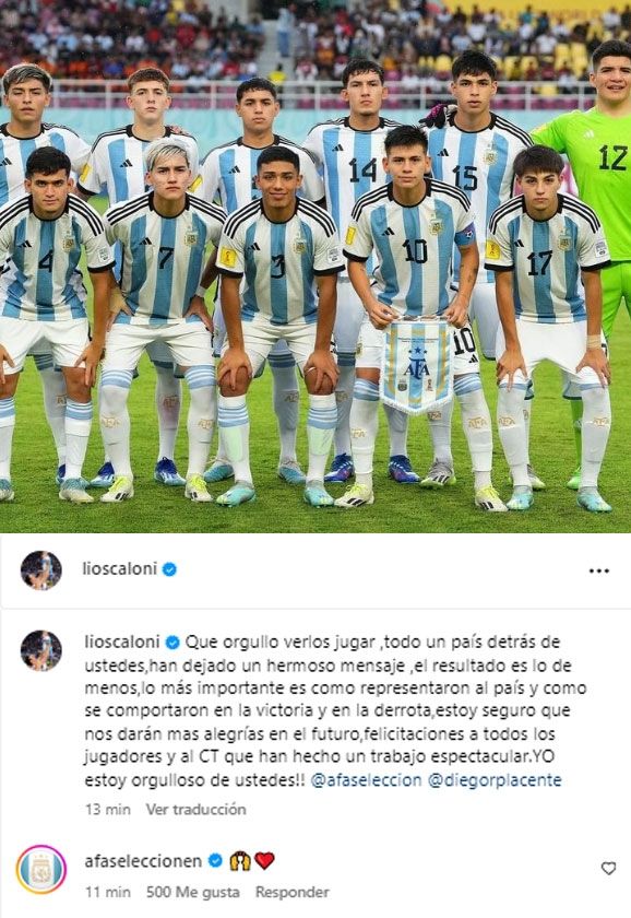 Sin embargo, Placente no fue el único espaldarazo. Minutos después de la derrota, el entrenador de la Selección mayor, Lionel Scaloni, posteó una imagen de la formación inicial de la Selección Sub 17, con un sentido mensaje de apoyo.