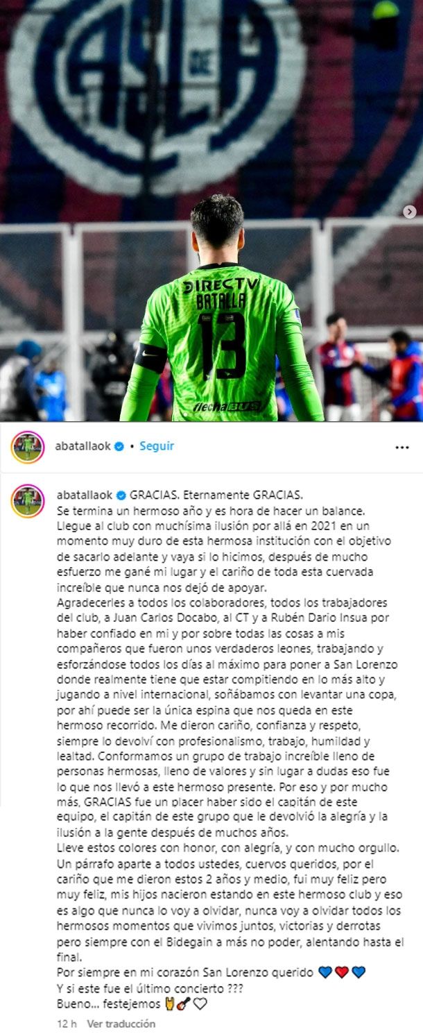 En este marco, uno de los que dejó un mensaje alarmante para el hincha fue el capitán del plantel, Augusto Batalla, quien posteó una foto e hizo un largo balance, el cual cerró con un texto en el que sembró dudas sobre su continuidad, considerando que su situación contractual aún no se resuelve.