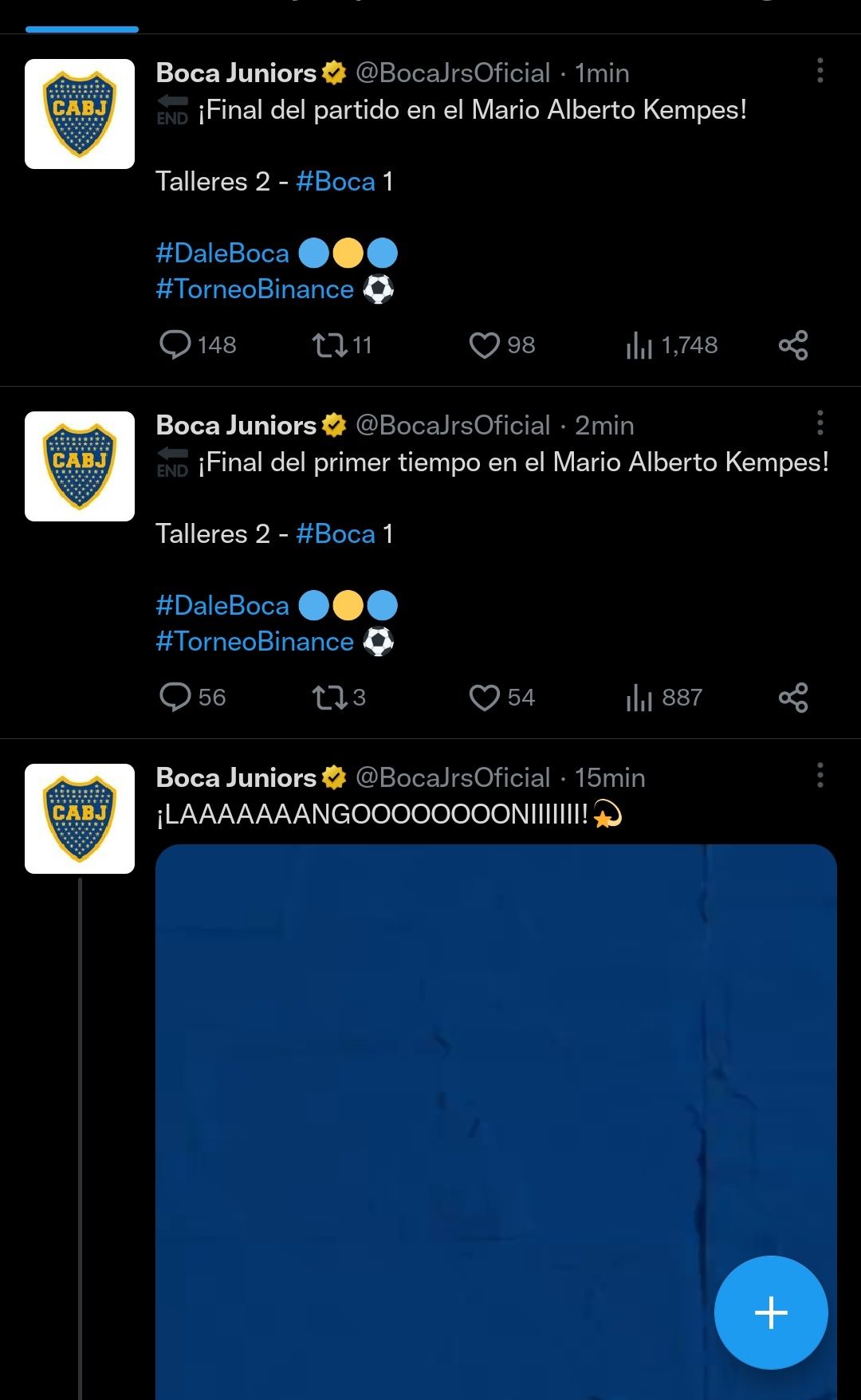 Como sucede en cada partido, quien maneja la cuenta @BocaJrsOficial tuiteó el resultado final del encuentro. Pese a tratarse de una publicación casi rutinaria, el CM se equivocó: "¡Final del primer tiempo! Talleres 2 - Boca Juniors 1".