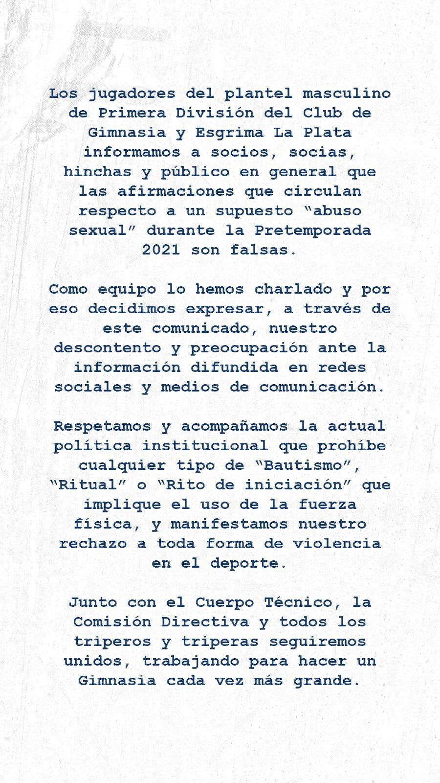 No obstante, distintas versiones fueron surgiendo con el correr de los días y una afirma que habría habido un caso de abuso sexual en estos ritos de iniciación a los más chicos del equipo. Ante esta situación, el actual plantel del Lobo sacó un comunicado con la intención de aclarar los hechos: "Los jugadores del plantel masculino de Primera División del Club de Gimnasia y Esgrima La Plata informamos a socios, socias, hinchas y público en general que las afirmaciones que circulan respecto a un supuesto ‘abuso sexual’ durante la pretemporada 2021 son falsas. Como equipo lo hemos charlado y por eso decidimos expresar, a través de este comunicado, nuestro descontento y preocupación ante la información difundida en redes sociales y medios de comunicación".