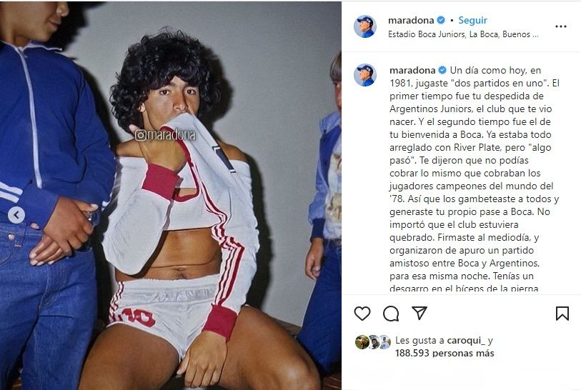 Sin embargo en la publicación de la cuenta oficial de Maradona la historia suena diferente: "Un día como hoy, en 1981, jugaste "dos partidos en uno". El primer tiempo fue tu despedida de Argentinos Juniors, el club que te vio nacer. Y el segundo tiempo fue el de tu bienvenida a Boca. Ya estaba todo arreglado con River Plate, pero "algo pasó". Te dijeron que no podías cobrar lo mismo que cobraban los jugadores campeones del mundo del '78. Así que los gambeteaste a todos y generaste tu propio pase a Boca".