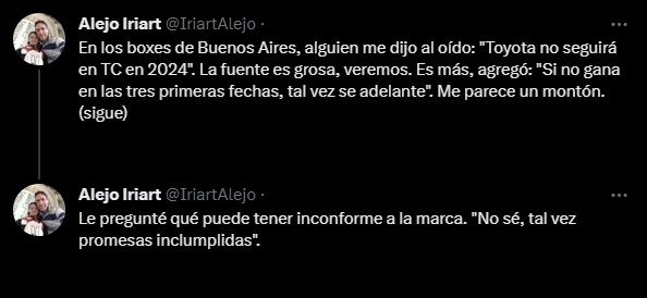 Alejo Iriart, reconocido periodista especializado en automovilismo, escribió en sus redes sociales que "en los boxes de Buenos Aires, alguien me dijo al oído: 'Toyota no seguirá en TC en 2024'. La fuente es grosa, veremos. Es más, agregó: 'Si no gana en las tres primeras fechas, tal vez se adelante'. Me parece un montón".