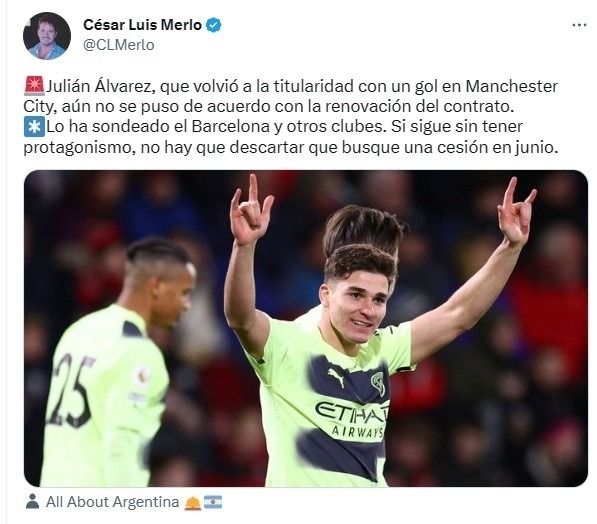 "Lo ha sondeado el Barcelona y otros clubes. Si sigue sin tener protagonismo, no hay que descartar que busque una cesión en junio. Es cierto que Julián tiene contrato hasta 2027, pero el club quiere mejorarlo luego del gran Mundial que hizo. Llevan un tiempo negociando y todavía no se ha llegado a un entendimiento", contó en la red social.