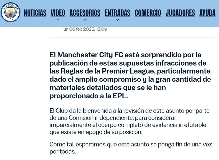 "El Manchester City está sorprendido por la acusación de este quebrantamiento de normas de la Premier League, especialmente por la ayuda y la vasta cantidad de materiales que le hemos dado a la Premier League", dijo el City en un comunicado, en el que además agrega: "El club da la bienvenida a la investigación de la comisión independiente, para que considere de forma imparcial las pruebas irrefutables que existen. Como tal, esperamos con ganas que esto termine con el asunto de una vez por todas".