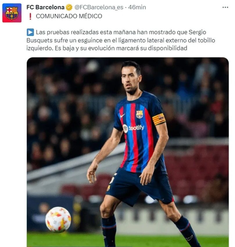 El capitán Culé se sometió a los estudios médicos que confirmaron un esguince en el ligamento lateral externo del tobillo izquierdo, informó el club catalán en el parte médico. El mediocampista, de 34 años, solo pudo jugar 7 minutos del partido del domingo ante Sevilla en el Camp Nou y luego fue reemplazado por Franck Kessie.