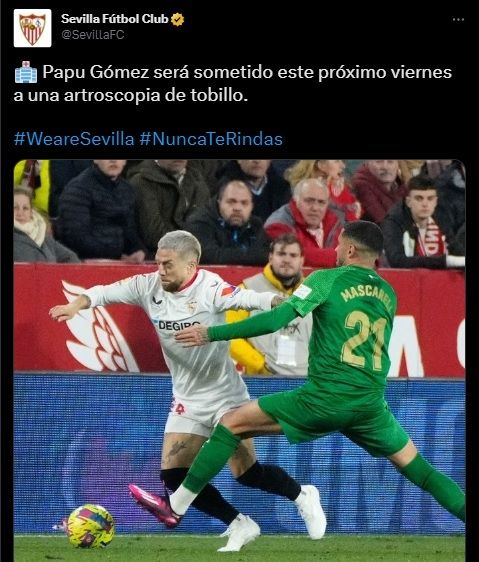 El club explicó en un comunicado que "el tratamiento conservador" seguido inicialmente por el internacional y campeón del mundo con la Selección argentina, "supervisado por los médicos" del club andaluz y de la Selección argentina, "fue evolucionando", aunque Papu Gómez "no se encuentra al cien por cien de su capacidad una vez comenzado el trabajo con el grupo".