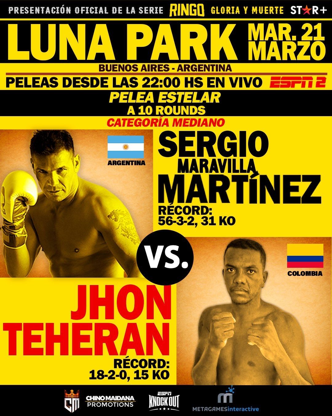 El motivo de esta decisión es que la pelea de Sergio "Maravilla" Martínez será solo un complemento del evento de presentación de la serie Ringo, gloria y muerte que comenzará a emitirse por la señal Star+. Allí los invitados podrán ver el primer capítulo de la serie y luego disfrutar del combate estelar entre el argentino y el colombiano, además de otros tres combates profesionales entre Laureano Sciuto y Héctor Sosa, en pluma; Brian Arregui y Matías Galucci, en superwelter; y Sebastián Castillo y Damián Arce, en gallo.