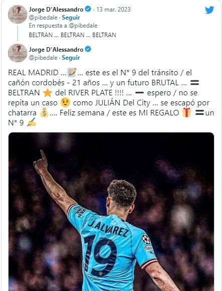 "Real Madrid, este es el número 9 del tránsito, el cañón cordobés, 21 años y un futuro brutal. Beltrán del River Plate. Espero que no se repita un caso como el de Julián en el City que se escapó por chatarra. Este es mi regalo, un número 9", escribió el mediático Jorge D'Alessandro, ex arquero de San Lorenzo y el Atlético de Madrid.