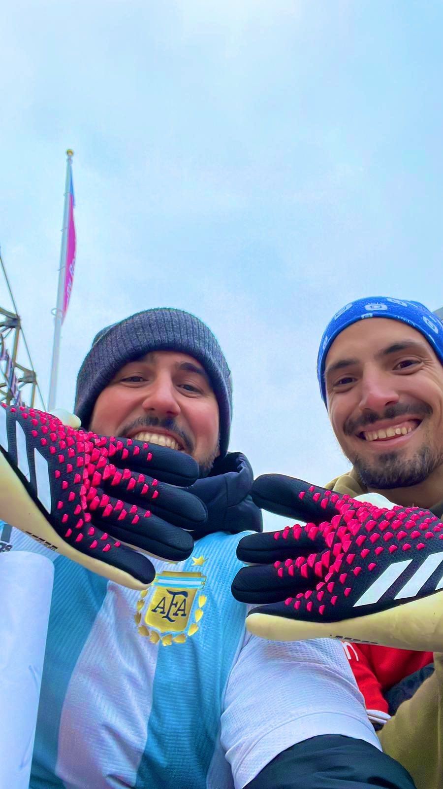 En el video se puede observar que uno de los muchachos tiene un cartel en su mano: "Dibu, doy mi vida por tus guantes", rezaba el mensaje.