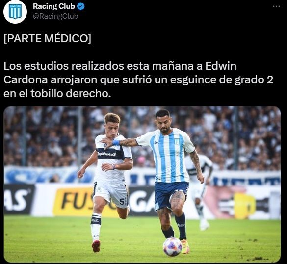 Racing sufrió una dura derrota el pasado fin de semana ante Gimnasia, en La Plata, y en las últimas horas se confirmó una pésima noticia que lamenta Fernando Gago. Es que, luego de dejar la cancha con mucho dolor, se confirmó la gravedad de la lesión de Edwin Cardona. El club, mediante un comunicado, informó que le realizaron estudios y los resultados de los mismos.