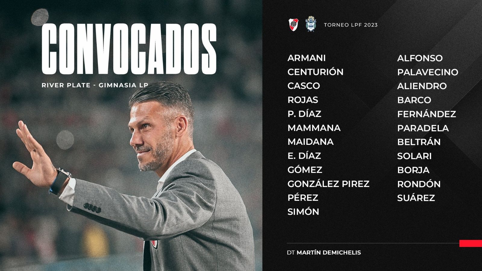 River Plate, líder de la Liga Profesional de Fútbol (LPF), recibirá esta tarde a Gimnasia y Esgrima La Plata con la misión de estirar su serie positiva de cinco triunfos en fila. El partido se jugará en el estadio Monumental desde las 19.30, con el arbitraje del neuquino Darío Herrera (TNT Sports), y Martín Demichelis volverá a tener la sensible baja de Nicolás De la Cruz.