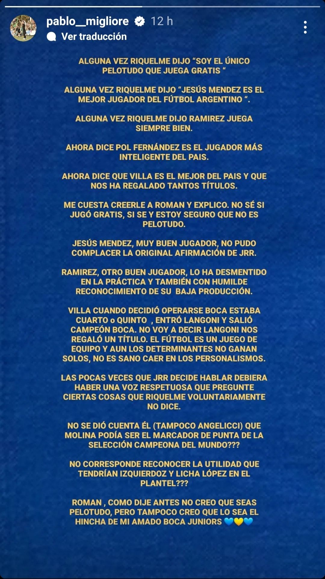 "Riquelme alguna vez dijo 'soy el único pelotudo que juega gratis'. Alguna vez Riquelme dijo 'Jesús Méndez es el mejor jugador del fútbol argentino. Alguna vez Riquelme dijo 'Ramírez juega siempre bien'. Ahora dice Pol Fernández es el jugador más inteligente del país. Ahora dice que Villa es el mejor del país y que nos ha regalado tantos títulos. Me cuesta creerle a Román y explico, no sé sí jugó gratis, sí sé y estoy seguro que no es un pelotudo".