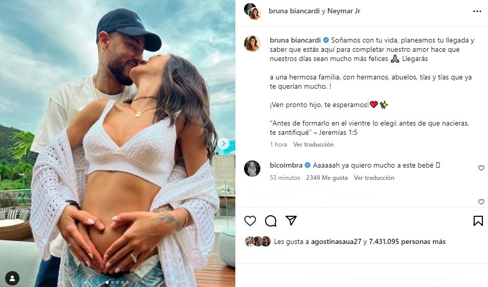 Y completaron su anuncio con un pasaje bíblico: "Antes de formarlo en el seno materno yo lo elegí; antes de que nacieras, yo lo separé". Según la prensa brasileña, Neymar, de 31 años, y Biancardi, de 29, están juntos desde 2021. Acompañaron su mensaje con varias fotografías en las que la pareja aparece abrazándose y sonriendo.