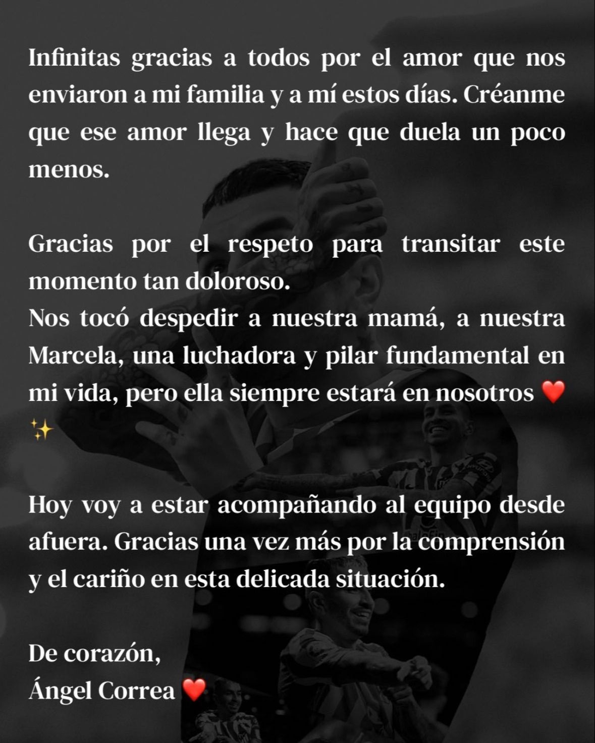 Fueron días muy duros para Ángel Correa. El campeón del mundo con la Selección argentina perdió a su mamá, Marcela, tras una larga batalla contra el cáncer. Por esta razón, el ex San Lorenzo no formó parte del partido del Atlético de Madrid ante el Rayo Vallecano, donde Nahuel Molina, su compañero en la Albiceleste, lo homenajeó e hizo aplaudir a todo el estadio.