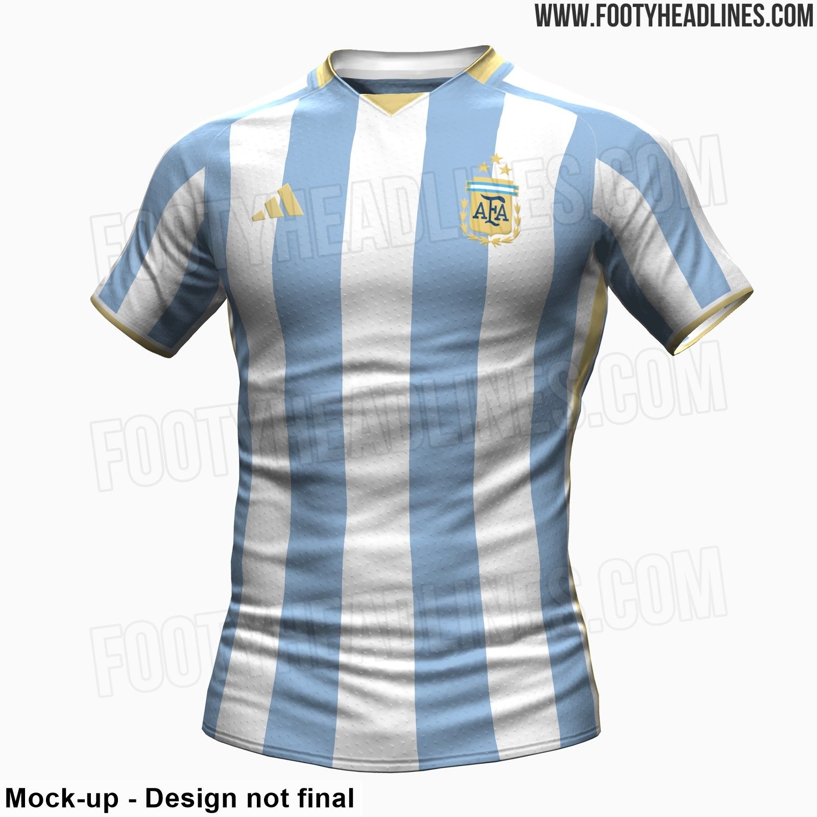 El sitio especializado Footy Headlines fue el responsable de la filtración, como lo ha sido en otras oportunidades, y rara vez se equivoca. La web aclaró que se trata de un bosquejo y no está nada oficializado, pero la idea de Adidas es incluir una nueva tonalidad de celeste e incorporar elementos en dorado, para dar un guiño a la obtención de la Copa del Mundo.
