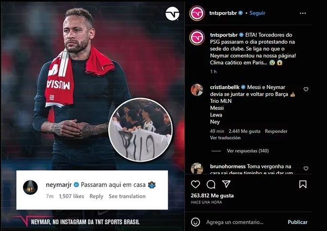 Una importante cadena deportiva de Brasil dio cuenta de los acontecimientos sucedidos en la capital europea a través de distintos posteos en Instagram y, en uno de ellos, Neymar se animó a dejar su comentario para dar prueba de las manifestaciones improvisadas: "Pasaron por aquí en casa".