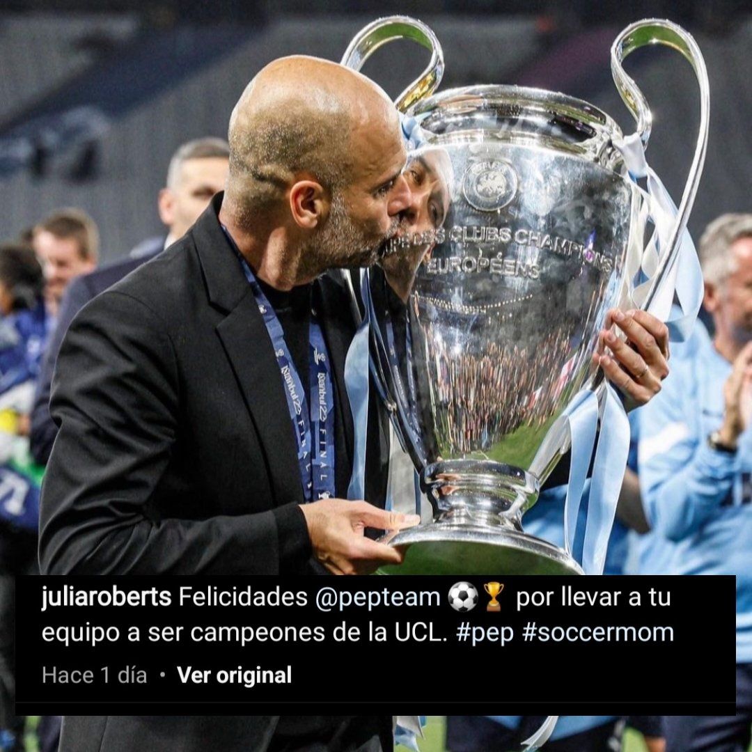 En dicha red social, la propia Julia Roberts subió una foto de Guardiola a su perfil y lo felicitó ante los ojos de sus 11 millones de seguidores: "Felicitaciones Pep por liderar a tu equipo hasta ser campeones de la Champions League", escribió la estadounidense.