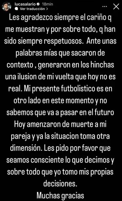 La denuncia la realizó mediante una historia en su cuenta personal, donde escribió: "Les agradezco siempre el cariño que me muestran y, por sobre todo, que han sido siempre respetuosos. Ante unas palabras mías que sacaron de contexto, generaron en los hinchas una ilusión de mi vuelta que hoy no es real".