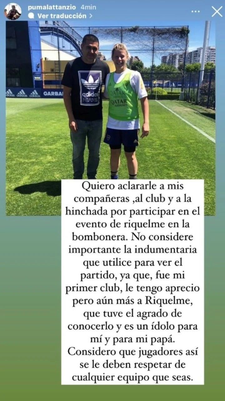 "No consideré importante la indumentaria que utilicé en el partido, ya que fue mi primer club. Le tengo aprecio, pero más aun a Riquelme, que tuve el agrado de conocerlo y es un ídolo para mí y mi papá. Considero que a jugadores así se les debe respetar de cualquier equipo que seas", escribió en una historia que subió a su cuenta de Instagram.