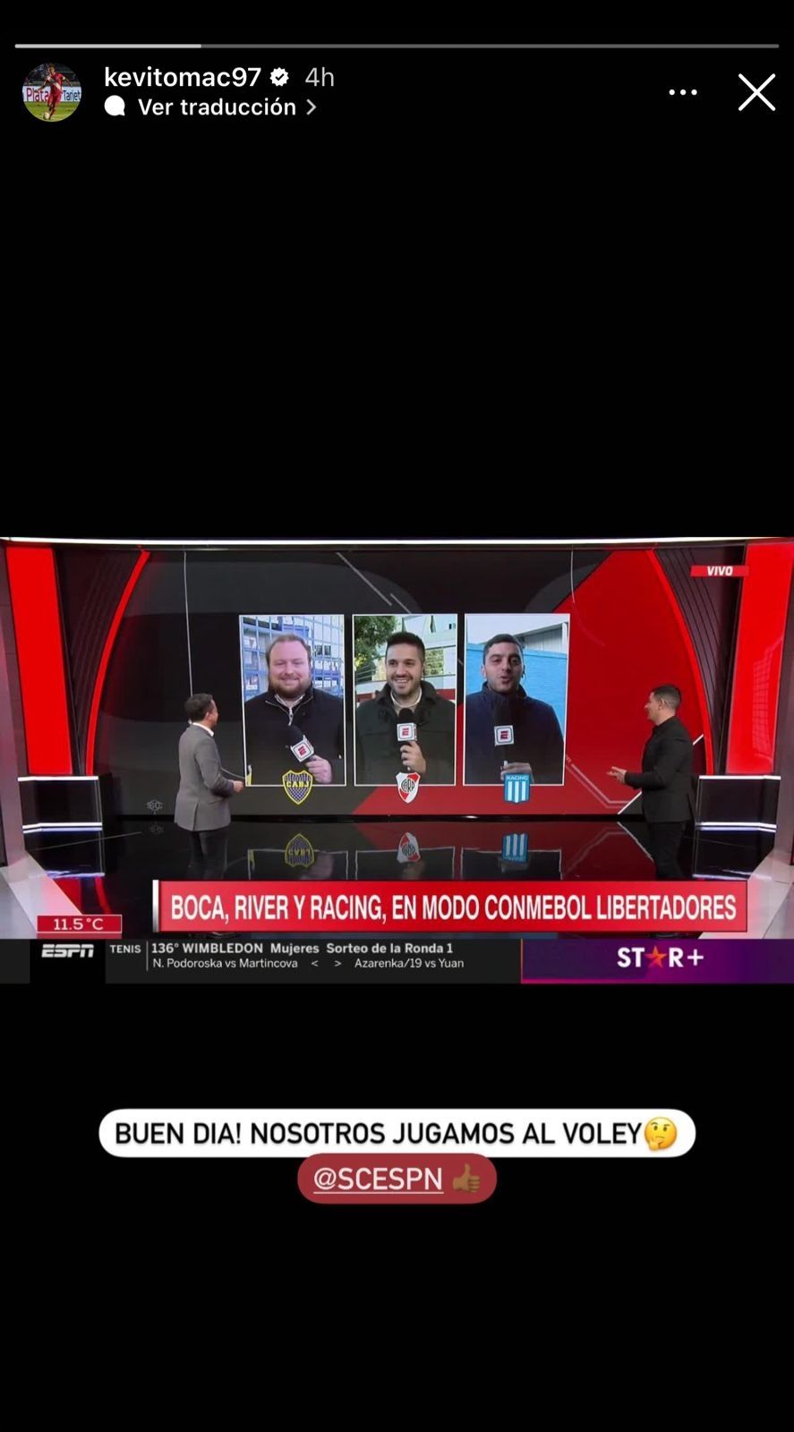 "Buen día. Nosotros jugamos al vóley", señaló Mac Allister junto a la foto de su televisor, que estaba encendido en el canal. Para la cobertura, ESPN dispuso de una pantalla partida con el periodista partidario de cada uno de los tres clubes, junto a un sócalo que rezaba: "Boca, River y Racing, en modo Conmebol Libertadores".