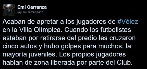 Esta información fue también replicada por el periodista partidario Emiliano Carranza que, en Twitter, escribió: "Acaban de apretar a los jugadores de Vélez en la Villa Olímpica. Cuando los futbolistas estaban por retirarse del predio les cruzaron cinco autos y hubo golpes para muchos, la mayoría juveniles. Los propios jugadores hablan de zona liberada por parte del Club".