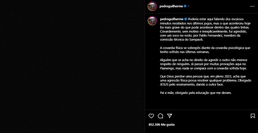 En sus redes sociales, Pedro contó: "Podría estar aquí hablando de los pocos minutos recibidos en los últimos partidos, pero lo que pasó hoy fue más grave que lo puede pasar dentro de las cuatro líneas. Cobardemente, sin motivo e inexplicamente fui atacado, golpeado en la cara por Pablo Fernández miembro del cuerpo técnico de Sampaoli".