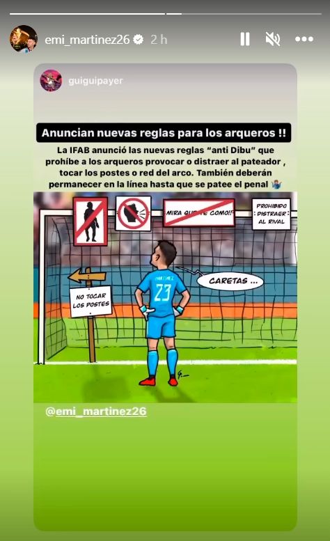 En sus historias de la red social en la que cuenta con 12.500.000 seguidores, Dibu Martínez reinstagrameó una caricatura del diseñador Guillermo Payer, que lo muestra al arquero de la Scaloneta con sus brazos en jarra, observando los detalles de la nueva regla, con carteles colgados en el arco que muestran la prohibición de hablar, bailar, tocar los postes o hasta en particular decir "mirá que te como". Incluso uno reza "prohibido distraer al rival".