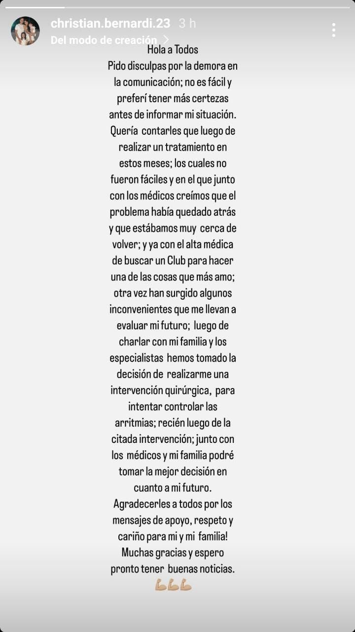 Luego, Bernardi contó los pasos a seguir para no abandonar el fútbol: "Luego de charlar con mi familia y los especialistas hemos tomado la decisión de realizarme una intervención quirúrgica, para intentar controlar las arritmias; recién luego de la citada intervención; junto con los médicos y mi familia podré tomar la mejor decisión en cuanto a mi futuro".