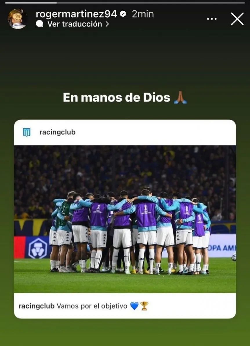 El posteo de Roger Martínez ilusiona a los hinchas de Racing, quienes lo consideran clave para el equipo. Y no es para menos, en Colombia ingresó en el complemento e influyó de gran manera en sus compañeros. En la revancha, donde la Academia dio vuelta tras el 2-4 en Colombia, marcó el primer gol y fue el abanderado de la remontada.