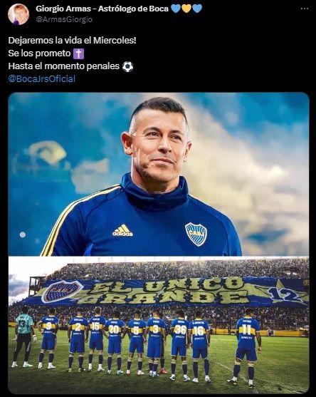 Antes de arrancar la llave, tres astrólogos expresaron que sería el xeneize el que avance a la siguiente instancias y, en las últimas horas, fue Giorgio Armas quien dio su predicción en las redes sociales. Con un posteo donde aparece Jorge Almirón, y abajo el equipo, escribió: "Dejaremos la vida el miércoles! Se los prometo. Hasta el momento penales".