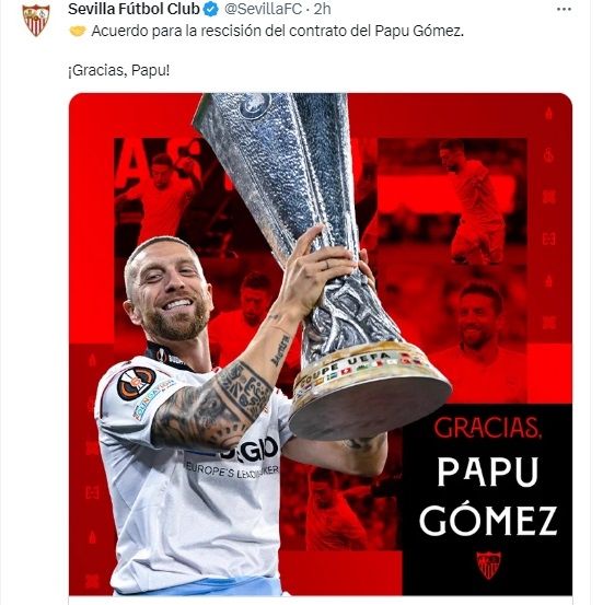 En un comunicado publicado en su página web, el club escribió: "El Sevilla y Alejandro 'Papu’ Gómez han llegado a un acuerdo para la rescisión del contrato que le unía a la entidad hasta el final de la presente temporada, 30 de junio de 2024. El centrocampista argentino -campeón del mundo con la albiceleste en el pasado Mundial- cierra así su etapa como sevillista, en la que ha disputado un total de 90 partidos entre todas las competiciones, con diez goles y seis asistencias en su haber".