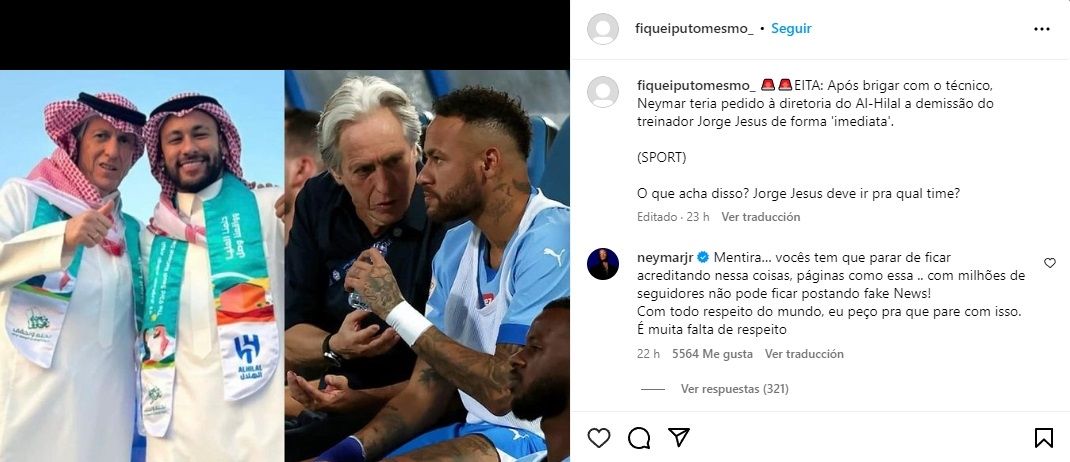 Esta versión fue tomada por un portal de Instagram, donde apareció Neymar para acallar los rumores con una fuerte respuesta. El portal escribió: "Tras pelear con el entrenador, Neymar habría pedido a la dirección del Al-Hilal que renunciara 'inmediatamente' al entrenador Jorge Jesús", y el volante no dudó: "Mentira...".