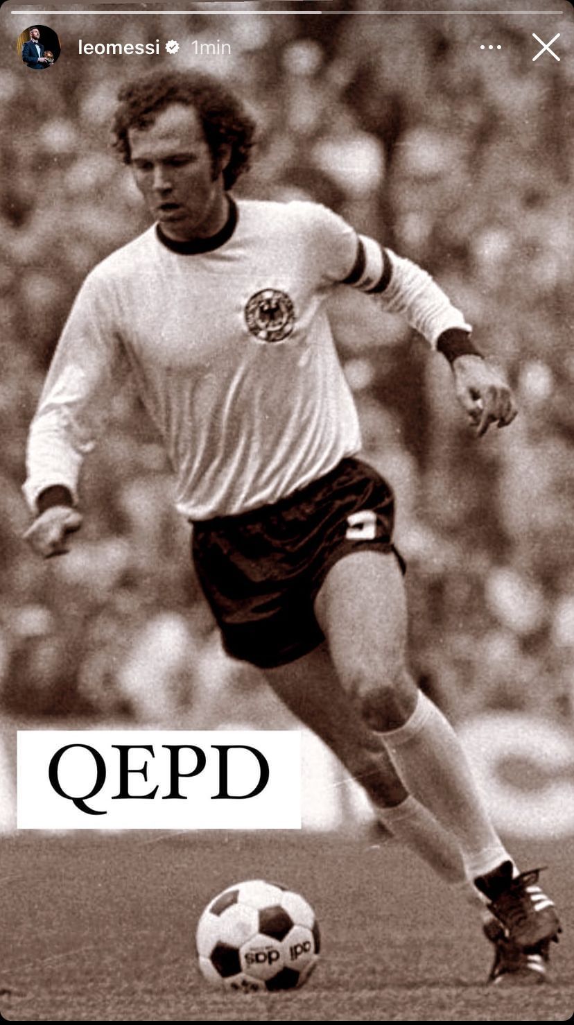 Los mensajes de despedida no tardaron en llegar y Lionel Messi le dedicó una historia de Instagram a Beckenbauer. El capitán de la Selección argentina eligió una imagen del Kaiser jugando con el seleccionado alemán y puso la leyenda: “QEPD (Que en paz descanses)”.