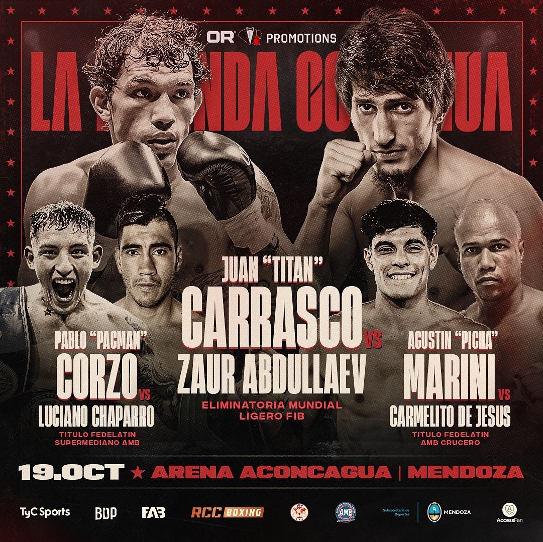 Juan Carrasco llegará a la contienda ante Zaur Abdullaev como número 12 del ránking de la Federación Internacional de Boxeo y siendo campeón latino en las 135 libras. Por su parte, el ruso, actualmente radicado en Yerevan, Armenia, vendrá a la arena mendocina siendo el número 5 de la carrera mundialista.