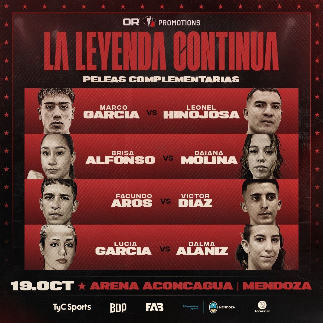 - El malargüino Marco "Kid Dinamita" García (14-1-0, 10 KO), quien se medirá con el crédito de Tunuyán, Leonel Hinojosa (8-4-0), en mediano a 6 rounds.
