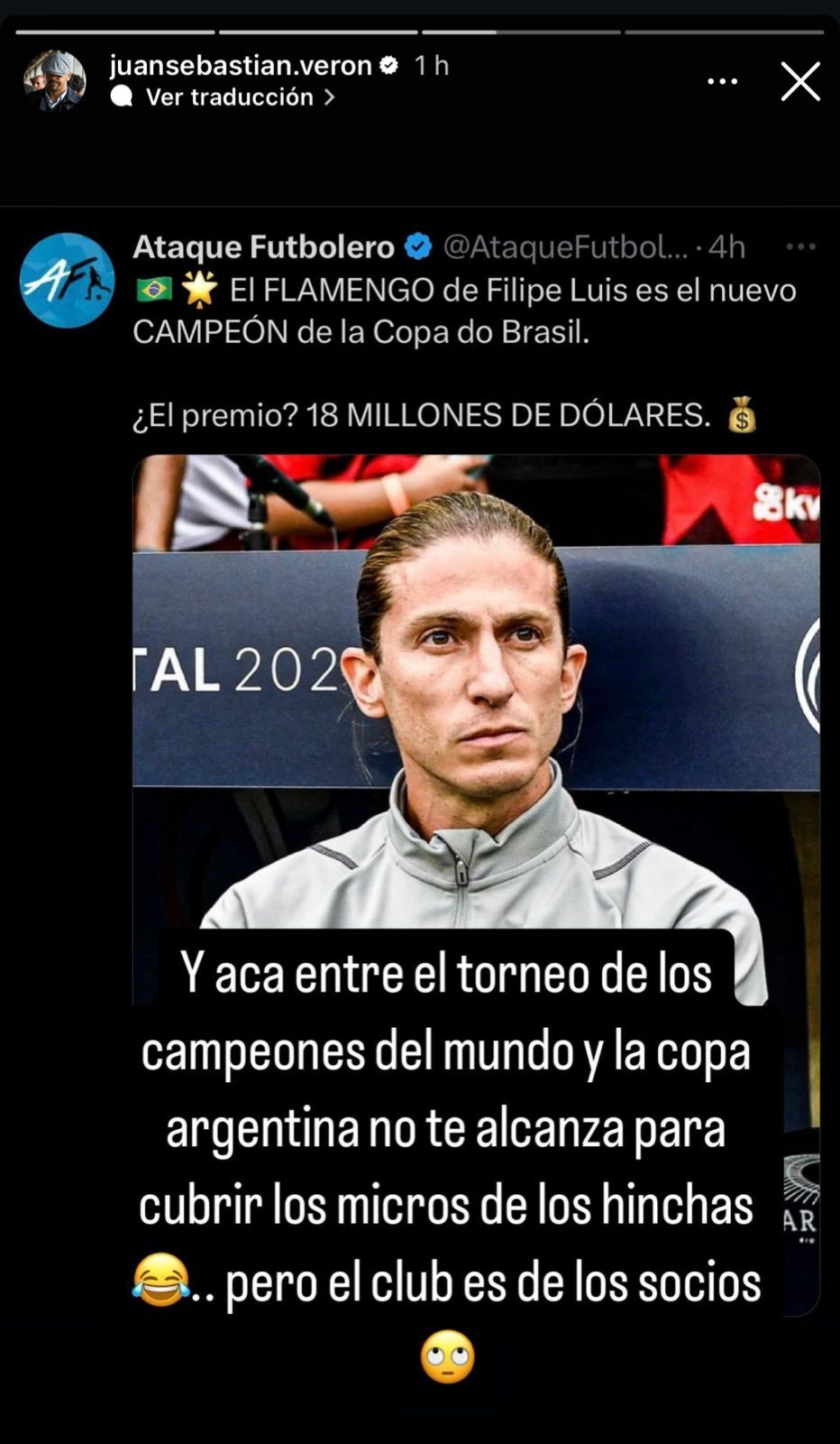 El Flamengo se consagró campeón de la Copa do Brasil al vencer 1-0 al Atlético Mineiro, flamante finalista de la Copa Conmebol Libertadores, y Verón reposteó en su cuenta de Instagram una publicación hecha en X que indicaba que el equipo de Filipe Luís había embolsado 18 millones de dólares a raíz de su conquista.