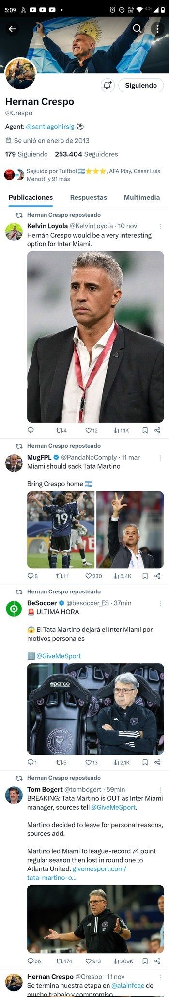De hecho, el propio Crespo alimentó los rumores sobre su llegada a Inter Miami porque desde su cuenta oficial en la red social X se pudo ver muchos posteos retuiteados, que brindaban la información de su llegada a las Garzas. Pudo tratarse de un error de quien controla su cuenta, el cual fue subsanado al cabo de unos minutos, retirando los retuits.