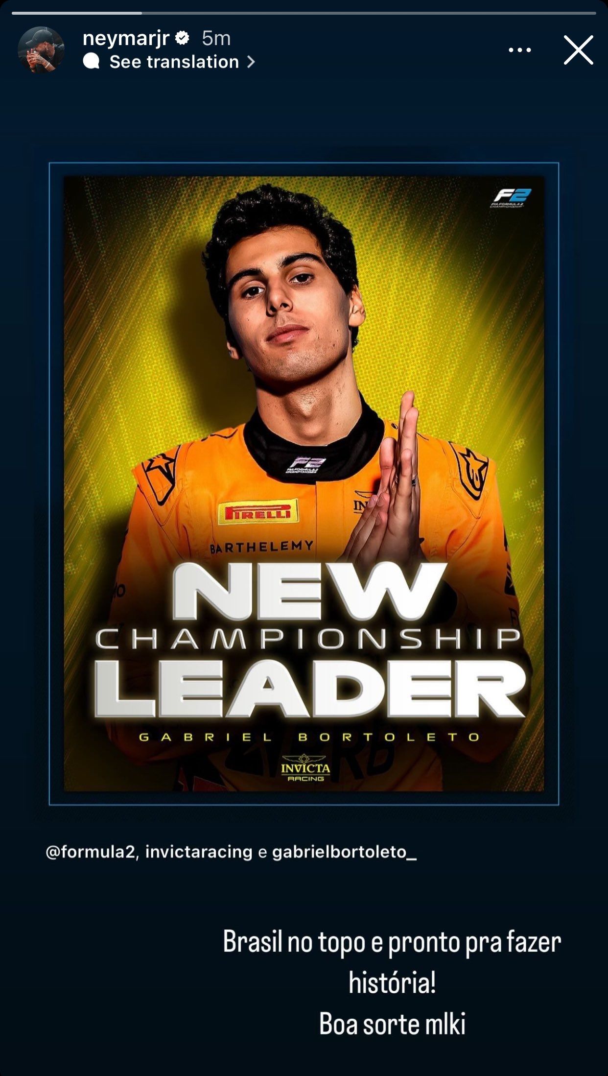 Kick Sauber acaba de confirmar a Bortoleto como su piloto para el año que viene. Acompañará a Nico Hülkenberg, y Guanyu Zhou y Valtteri Bottas ya no serán parte del equipo. Una gran noticia para todo Brasil, que siempre ha apoyado a su joven estrella del automovilismo. Es el caso de Neymar Jr.: cuando había un contexto de incertidumbre y ansiedad respecto de quién ocuparía el lugar en Sauber, el futbolista del Al-Hilal de Arabia Saudita subió a sus redes sociales una foto de Bortoleto con un mensaje de apoyo hacia él, luego de que este tomara el primer puesto del Campeonato de Pilotos de la Fórmula 2: “Brasil en la cima y listo para hacer historia. Buena suerte”. Gracias al aliento de Neymar o no, la suerte llegó; y Gabriel Bortoleto se unirá a la Fórmula 1 desde el año próximo.
