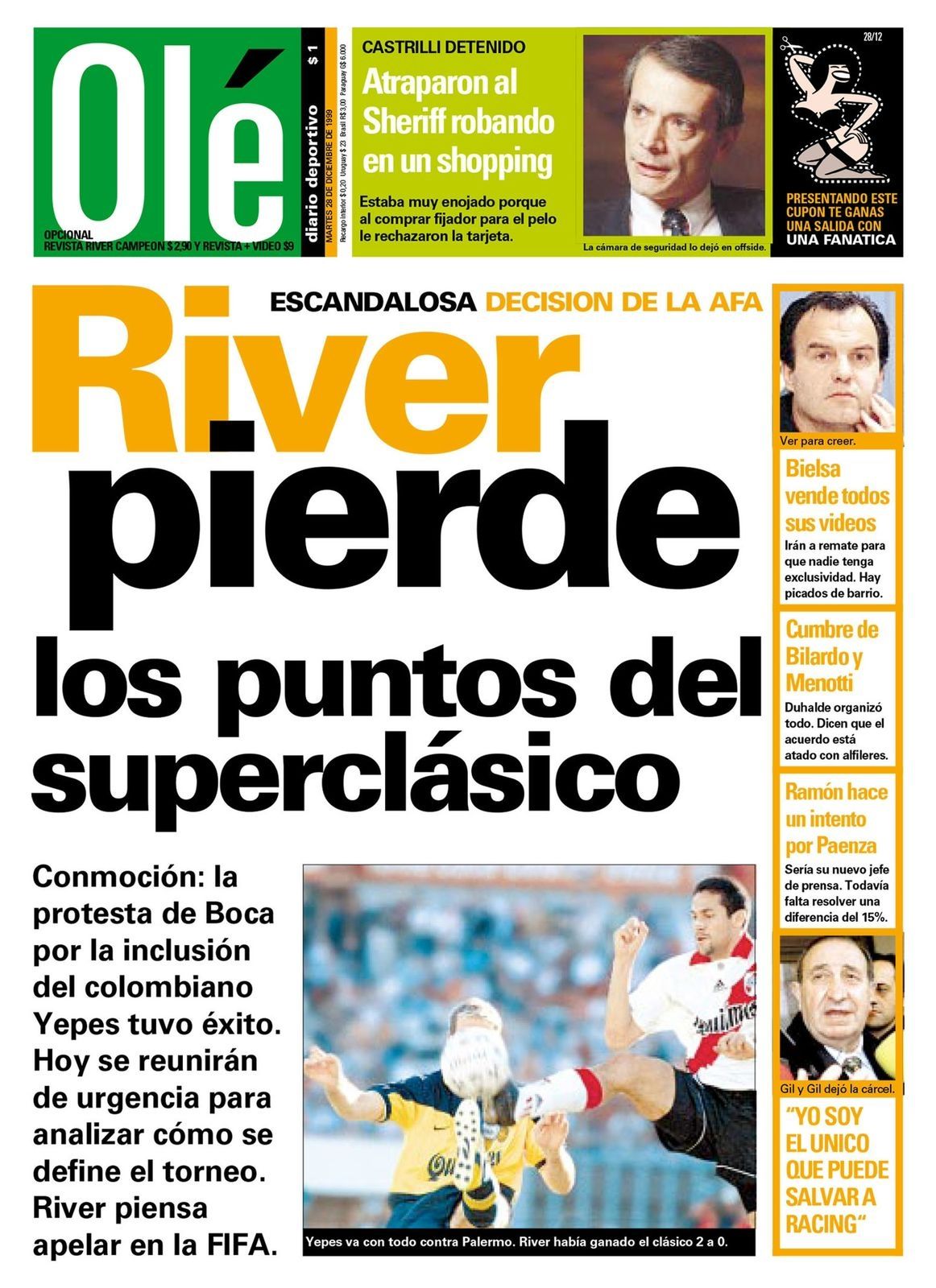 Otra tapa de Olé que no fue placentera para los hinchas millonarios. “River pierde los puntos del Superclásico”, tituló el diario el 28 de diciembre de 1999, por una supuesta ilegítima inclusión del colombiano Mario Yepes en el equipo. Carlos Bilardo, César Luis Menotti, Marcelo Bielsa y el árbitro Javier Castrilli tampoco pudieron evadir las bromas.